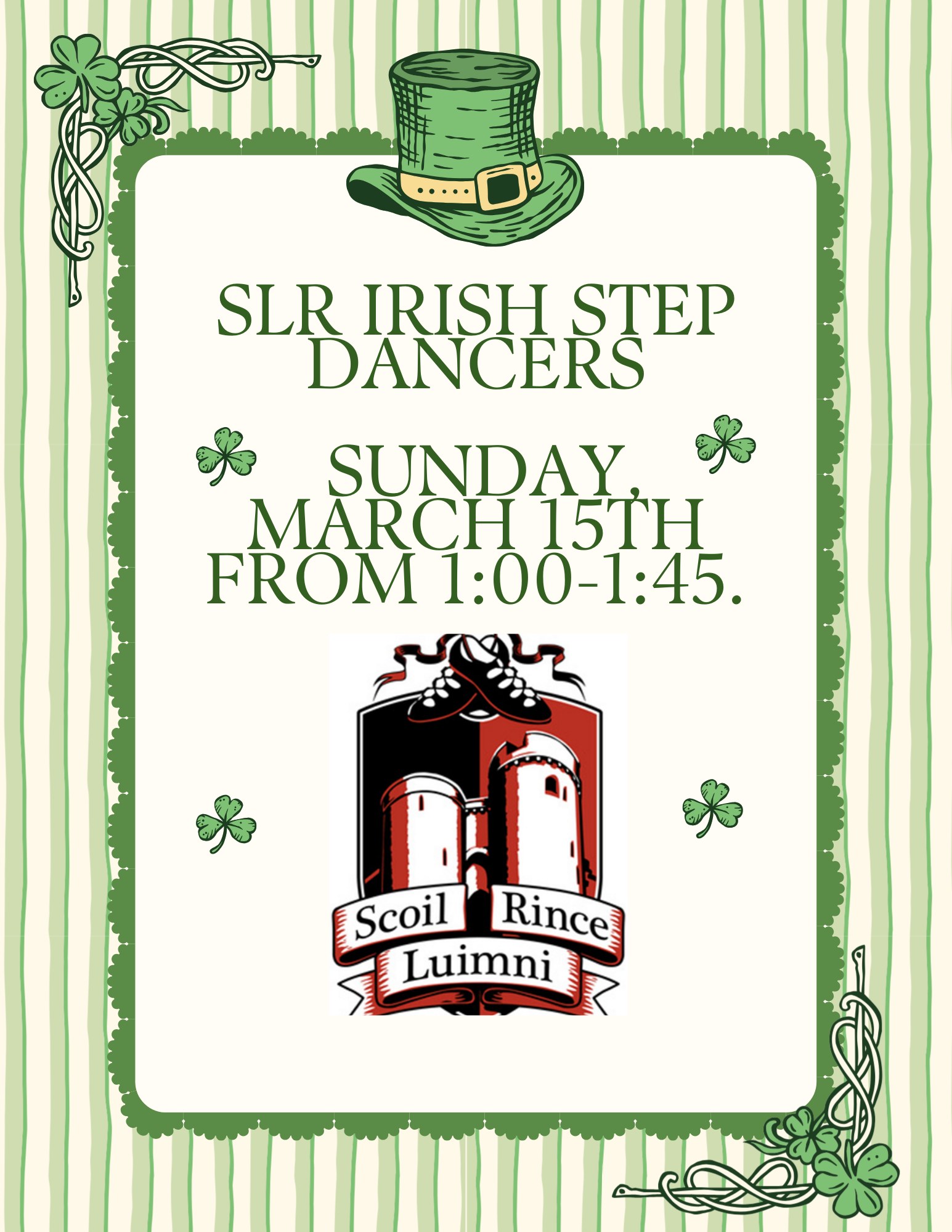 • Live performance by SLR Irish Dancers: 1:00–1:45 PM