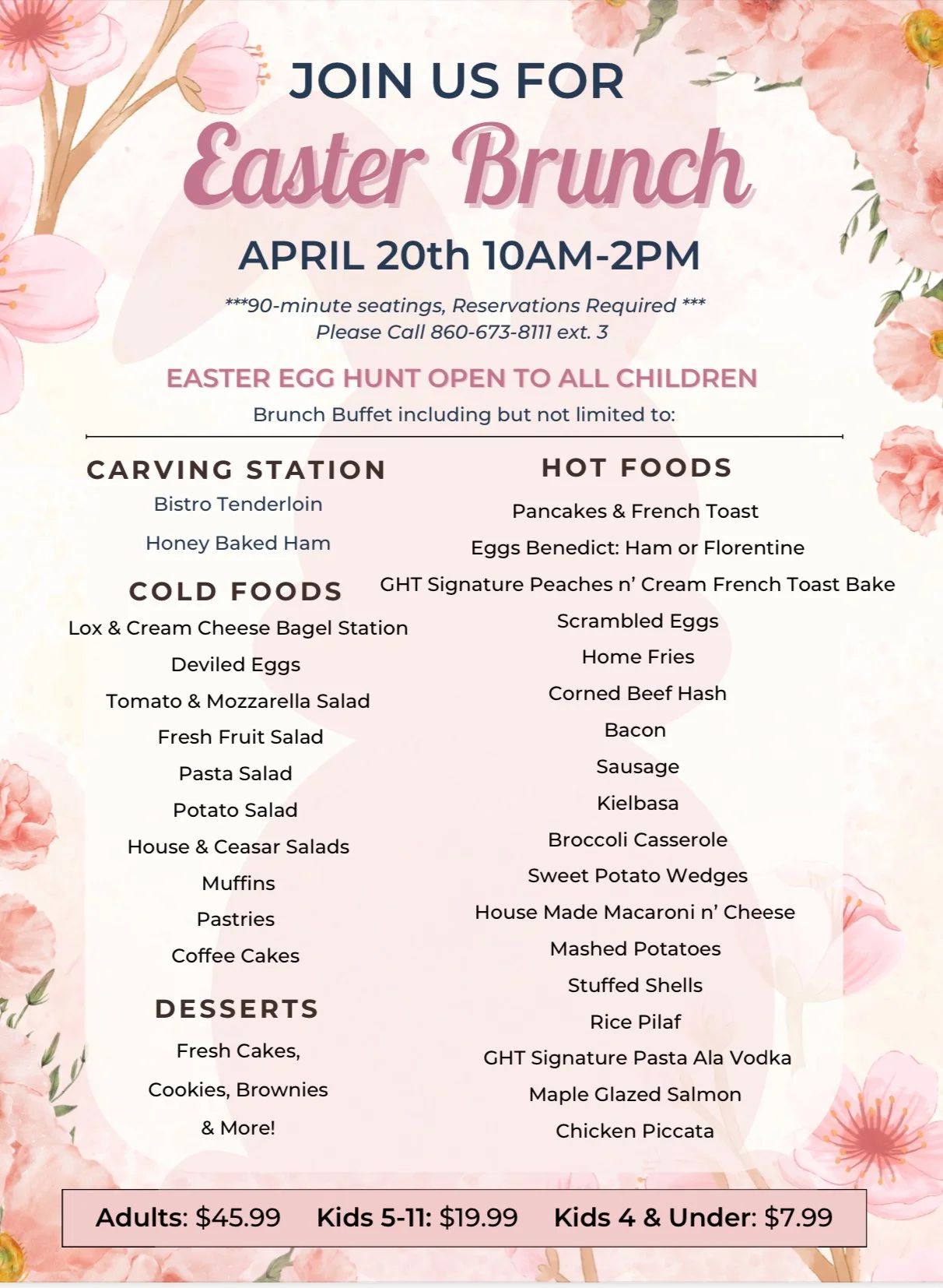 We have special events often! Make sure to stay in the loop. Apr 20 Easter Brunch Sunday, April 20, 2025 10:00 AM 2:00 PM Google Calendar ICS View Event → Mar 16 Irish Dancers Sunday, March 16, 2025 4:25 PM 5:25 PM Google Calendar ICS View Event → Mar 16 Brunch Sunday, March 16, 2025 10:05 AM 2:05 PM Google Calendar ICS View Event → Mar 13 to Mar 17 St. Patty's Day Menu Thu, Mar 13, 2025 3:00 PM Mon, Mar 17, 2025 8:05 PM Google Calendar ICS View Event →